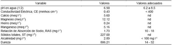 Se usó agua de riego muy dura, pH 6.90 y conductividad eléctrica (CE) de 0.43 mmhos cm-1, en niveles óptimos (Tabla 2).