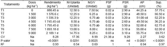 NV/planta = número de vainas/planta; NG/V = Número de granos/vaina; PSF = peso seco de follaje; PSR = peso seco de raíces, AP = altura de plantas; Sup = supervivencia. T1: Testigo absoluto (con 0 kg ha-1 de compost); T2: 1 500 kg ha-1 de compost; T3: 3 000 kg ha-1 de compost; T4: 4 500 kg ha-1 de compost; T5: 6 000 kg ha-1 de compost; T6: 7 500 kg ha-1 de compost; T7: 9 000 kg ha-1 de compost. Na = no aplica; ns = no significativo; medias con una letra común no son significativamente diferentes (p > 0.05). Test de separación de medias Duncan.