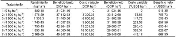 Para los costos variables y los beneficios netos de cada tratamiento, la aplicación de 1 500 kg ha-1 produjo el mayor beneficio neto (aproximadamente 757 USD) (Tabla 5), seguido por la aplicación de 4 500 kg ha-1 de compost (aproximadamente 698 USD). El mayor costo variable correspondió al tratamiento 7 de aproximadamente 337 USD (Tabla 5). Debe indicarse que el único costo variable tomado en consideración fue el costo del fertilizante, ya que las demás tareas fueron pagadas por día para toda el área del experimento.