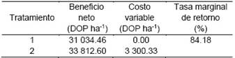 La tasa marginal de retorno (TMR) indica que al aplicar 1 500 kg ha-1 (tratamiento 2) de compost por tratamiento, genera un mayor beneficio neto, comparado con el tratamiento de más bajo costo variable (testigo sin aplicación de compost) lo que se aprecia en la Tabla 6. Se observa que TMR es de 84.18 % cuando se relacionan ambos tratamientos. Esto quiere decir, que por cada DOP invertido en la aplicación de compost se obtiene un retorno de 84.18 DOP en relación con la no aplicación de este.