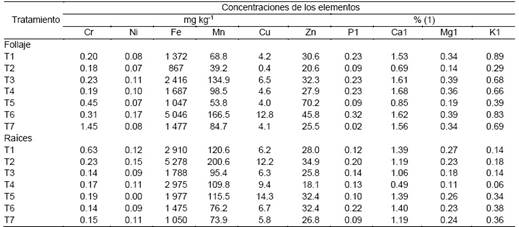 El contenido de Fe, Mn y Zn en todos los tratamientos es alto, mientras que el de Cu es adecuado (Tabla 7). Por otra parte, el contenido de P, Ca y Mg es bajo y el K alto. En relación con el contenido de los elementos pesados Cr y Ni los contenidos son bajos, no representando peligro para la salud del consumidor. El contenido de Fe, Mn y Zn en las raíces son elevados y al igual que el follaje el Cu es mayormente adecuado. En relación con el P, Ca, Mg y K se encuentran bajo. El Cr y Ni se encuentran en niveles adecuados, ya que estos contenidos no representan peligro para la salud humana.
