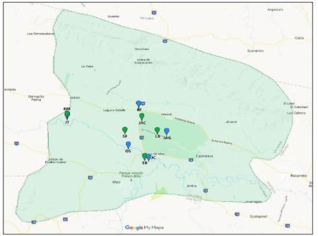 El estudio se realizó entre la última semana de junio del 2015 y primera semana de marzo del 2016, en diez parcelas, cinco de manejo convencional y cinco de manejo orgánico, de cinco zonas bananeras de la provincia Valverde (dos por zona), de la República Dominicana, entre los 19° 34′ 146′′ de latitud norte y 71° 09′ 77′′ de longitud este: Cruce de Guayacanes (Laguna Salada, 84 m s.n.m.; 19° 38′ 885′′ N y 71° 03′ 859′′ W), Guazumita (Esperanza, 80 m s.n.m.; 19° 36′ 703′′ N y 71° 01′ 829′′ W), El Charco (Laguna Salada, 68 m s.n.m.; 19° 35′ 649′′ N y 71° 04′ 628′′ W), Palo Amarillo (Mao, 73 m s.n.m.; 19° 34′ 146′′ N y 71° 03′ 203′′ W) y Los Cáceres (Jaibón, 54 m s.n.m.; 19° 37′ 956′′ N y 71° 09′ 77′′ W) (Figura 1).