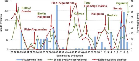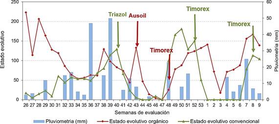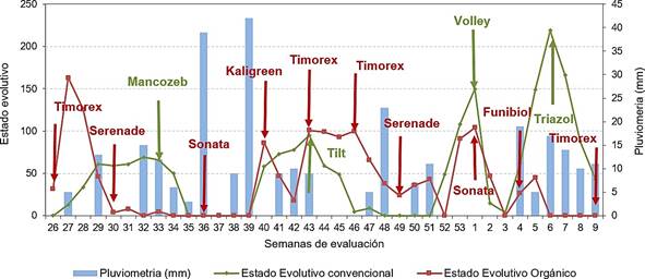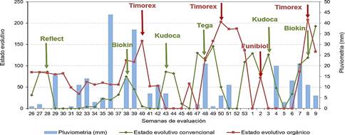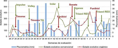 El estado evolutivo de la enfermedad en ambos sistemas de producción tiene la misma tendencia, diferenciándose solo por el momento de aplicación y la eficacia del producto utilizado. A continuación, se discute zona a zona: