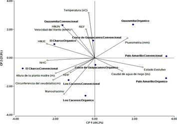 Estas variables se correlacionan con las localidades de El Charco en los dos sistemas de producción de bananos. Separados a la derecha del eje vertical de las coordenadas en mayor magnitud se encuentran aquellas variables medidas en Palo Amarillo y Guazumita para el sistema orgánico (Figura 7).
