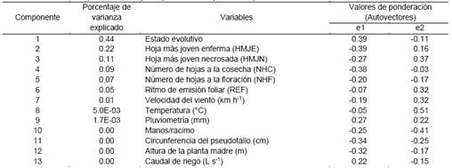 Las variables más sensibles seleccionadas en el componente principal 1 (CP1) para los sistemas y zonas de producción fueron: EE, pluviometría y riego (caudal de agua utilizado). En menor magnitud de correlación se encuentran las variables temperatura, HMJE y HMJN, NHF, NHC, REF, altura de la planta madre, circunferencia del pseudotallo y manos/racimo.