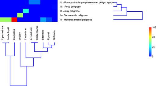Figura 2 Clusterización bidireccional de plaguicidas agrícolas empleados en los cultivos andinos en la “mancomunidad del río Opamayo”, según la clasificación recomendada de los plaguicidas por el peligro que presentan.