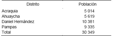 La población abarcó a 30 349 habitantes de los distritos de Pampas, Ahuaycha, Acraquia y Daniel Hernández (INEI, 2017), según la Tabla 1.