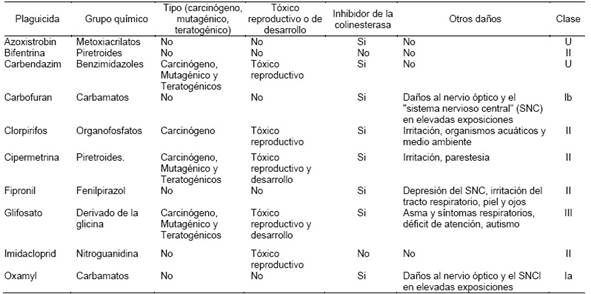 Además, se identificó que carbendazim, cipermetrina y glifosato son del tipo carcinógeno, mutagénico y teratogénicos; clorpirifos del tipo carcinógeno; carbendazim, clorpirifos e imidacloprid son tóxicos reproductivos; cipermetrina y glifosato son tóxicos reproductivos y del desarrollo; azoxistrobin, carbendazim, carbofuran, clorpirifos, cipermetrina, fipronil, glifosato y oxamyl son inhibidores de la colinesterasa; y, bifentrina e imidacloprid no son inhibidores de la colinesterasa. Cabe resaltar que, de los plaguicidas reportados, el oxamyl está clasificado como Ia “sumamente peligroso”, seguido del carbofuran Ib “muy peligroso (Organización Mundial de la Salud y Programa Internacional de Seguridad de las Sustancias Químicas, 2020).Sin embargo, clorpirifos (organofosforado), son aplicados alrededor del 90 % de los cultivos agrícolas, afectando al ser humano y el ambiente; estos plaguicidas fueron prohibidos o su uso restringido en varios países dada su elevada incidencia de reacciones adversas (Silveira-Gramont et al., 2018).