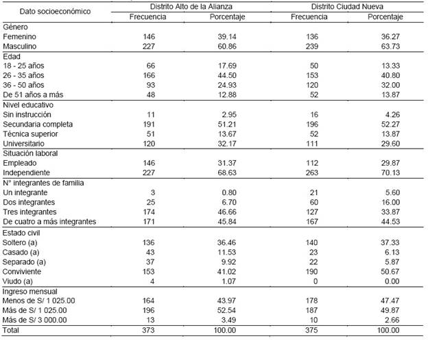 En la Tabla 1 se puede evidenciar los datos socioeconómicos de la población encuestada en los distritos Alto de la Alianza y Ciudad Nueva, ubicados en la ciudad de Tacna, Perú.
