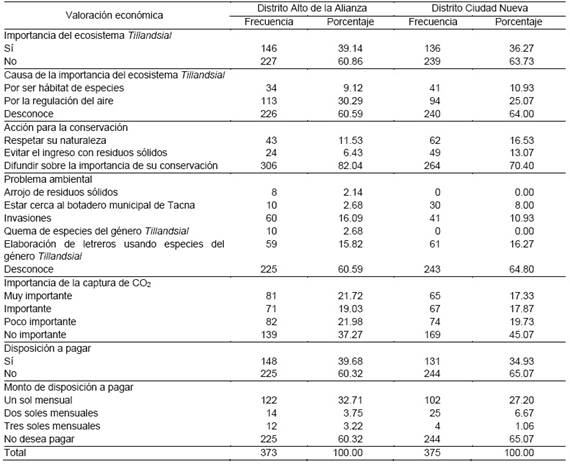 En la Tabla 2, se puede evidenciar los la valoración económica del Tillandsial según la percepción de la población de los distritos Alto de la Alianza y Ciudad Nueva, ubicados en la ciudad de Tacna, Perú.