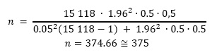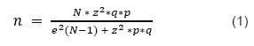 Dónde: n = tamaño de la muestra a ser encuestada; N = total de la población; Z = nivel de confianza al 95 % (margen de error del 5 %) de acuerdo a la tabla de distribución normal le corresponde el valor de 1.96; p = proporción esperada (en este caso 50 % = 0.5); q = 1-p (en este caso 50 % = 0.5); E = error de estimación de 5 % (valor de 0.05).