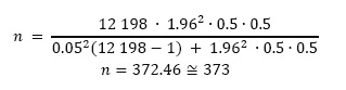 La población de estudio del Distrito Alto de la Alianza estuvo constituida por 12 198 habitantes, mientras que la del Distrito Ciudad Nueva por 15 118 personas, según lo indica la Dirección Regional de Salud de Tacna (2023), por lo que se aplicó la fórmula de muestreo propuesta por Yamane (1967), como se muestra en la Ecuación 1.