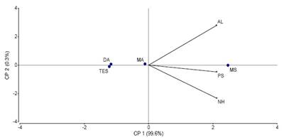 El análisis de prueba de Duncan realizado para la altura de las plantas (AL) no mostró diferencias estadísticas significativas entre los tratamientos (Tabla 4). Sin embargo, a pesar de no haber diferencias significativas en las variables evaluadas para el desarrollo de las plantas, el análisis de componentes principales, evidencia que las variables tienen afinidad con el tratamiento a base de bacterias MOSY21 (MS) identificada como P. plecoglossicida, lo que indica que hay una tendencia a mejora de las plantas por acción del tratamiento con bacterias PCPRs (Figura 2). Con los resultados del análisis de componentes principales, se puede sustentar, que las bacterias promotoras de crecimiento vegetal contribuyen al desarrollo de las plantas de banano. Diferentes investigadores han realizado publicaciones en la que demostraron que las bacterias PGPRs promueven el desarrollo de las plantas de banano (Ochoa et al., 2022; Jaizme-Vega et al., 2003) y otros cultivos (Sánchez, 2011; Di Salvo et al., 2018; Hussain et al., 2022).