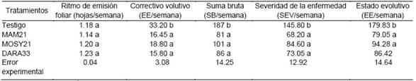 Tabla 3 Valores promedios de ritmo foliar, correctivo evolutivo, suma bruta, severidad y estado evolutivo de la enfermedad Sigatoka negra (n = 20).
