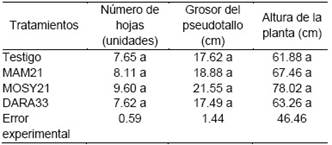 Tabla 4 Valores promedios de número de hojas, grosor de pseudotallo y altura de plantas de banano (n = 4).