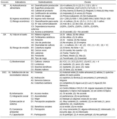 Para la evaluación de la sustentabilidad, se empleó la metodología de análisis multicriterio "Marco para la Evaluación de Sistemas de Manejo de Indicadores de Sostenibilidad de los sistemas de producción", propuesta por Sarandon y Flores (2009). Con el fin de detectar aspectos que influyen en la sostenibilidad del agroecosistema en el área de estudio se identificaron respectivamente los indicadores y subindicadores. Tabla 1. Los cuales se ponderaron en una escala de 0 a 4, donde cero representa el menor valor de sustentabilidad y cuatro el mayor valor. Para considerar como sustentable un indicador o el Índice de Sustentabilidad General (ISG) correspondía alcanzar un valor mayor o igual a dos, punto medio de la escala, la cual también permitió identificar los puntos críticos (Sarandon et al., 2006). Asimismo, para considerar un predio con el ISG sustentable, ninguna de las dimensiones debe tener un valor menor al punto medio de la escala. El procesamiento y análisis de los datos se realizaron utilizando Excel e Infostat-2020.