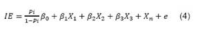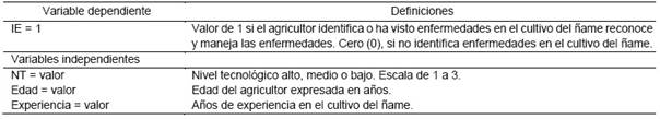 Donde: IE = identificación de enfermedades en ñame; X1, X2, X3, Xn = nivel tecnológico, experiencia y edad del productor en años.