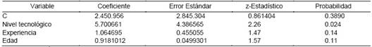 De un conjunto grande de variables que podría considerarse como variables explicatorias se seleccionaron las que presentaron mayor robustes una vez se hizo el análisis de correlación y diagnóstico de datos. Algunas variables no estaban expresadas directamente en la respuesta de los productores a la encuesta como el caso del nivel tecnológico que fue producto de la combinación de variables como uso de prácticas como tratamiento de semilla, preparación de suelo, análisis de suelos dando lugar a tres niveles tecnológicos uno bajo que son aquellos agricultores que no tratan semilla ni preparan suelos ni hacen análisis de suelos ocupan el 40% de la muestra encuestada, un segundo grupo o nivel dos son aquellos agricultores que tratan semilla, combinan preparación manual de suelos y con maquinaria participan con el 8% de la muestra y el nivel tecnológico tres son aquellos agricultores que tratan la semilla, hacen análisis de suelos y preparan el suelo con maquinaria corresponden al 52% de la muestra encuestada. Al momento de estimar el modelo por máxima verosimilitud se tuvo en cuenta las características de los estimadores como varianza mínima, insesgados, con ausencia de autocorrelación (Gujarati y Porter, 2004).