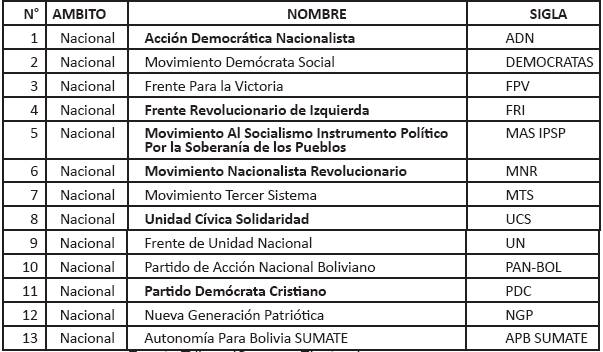 El cuadro reúne a los partidos políticos registrados por el Tribunal Supremo Electoral, los partidos señalados con rojo son organizaciones que ya existían con personería jurídica desde antes de la nueva normativa de organizaciones políticas, se puede decir que son partidos antiguos, y los partidos marcados con negro son partidos que se han creado en el marco de la nueva normativa, son partidos nuevos.