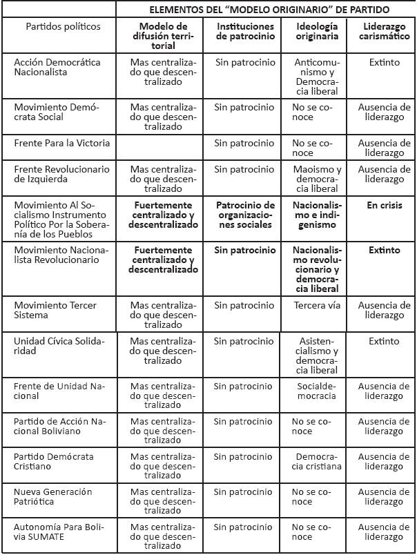 Ahora bien, una vez que tenemos una aproximación al “modelo originario” de partido del MAS-IPSP, ensayemos un análisis comparado incluyendo a los demás partidos. En el siguiente cuadro se presentan los partidos políticos vigentes en Bolivia.