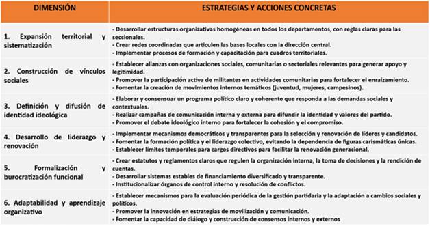Esta propuesta multidimensional de la institucionalización partidista es un proceso complejo que involucra tanto aspectos formales (estructuras, reglas, burocracia) como culturales (valores, identidad, liderazgo) y relacionales (vínculos sociales, adaptabilidad). El fortalecimiento simultáneo de estas dimensiones permite que los partidos superen la fragmentación, la volatilidad y la crisis de representación, consolidándose como organizaciones capaces de perdurar, representar intereses sociales y contribuir a la gobernabilidad democrática. En el marco de esta propuesta, la institucionalización de los partidos supone actividades y logros de objetivos, a mediano y largo plazo. Algunos de los indicadores de verificación de este proceso son: