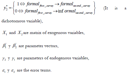 Equations (25) and (26) represent the structural form of the model of simultaneous equations with qualitative dependent variable to model the formality (informalization).