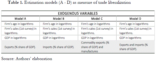 To capture the effect of managerial abilities via trade openness on the probability of informalization of formal firms, we make use of four different measures of trade: exports plus imports, exports, imports, exports of commodities, exports of manufactures, all of them as share of GDP. We regress 4 models (summarized in equations (1) and (2)) that analyze the relationship between the level of sales and the likelihood that a formal business continues as such or moves to informality, along with the impact of several measures of trade openness at country level. Therefore: