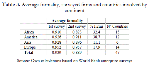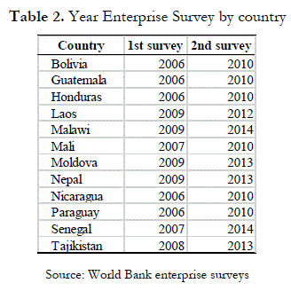 The data for the analysis of firm informalization are extracted from the Enterprise Surveys that were conducted by the Analysis Unit of the World Bank. The surveys are the result of implementing a comprehensive methodology in different countries and years. The Enterprise Surveys contain detailed information at firm level: company size, age, technology, cost structure, sales level, etc. The surveys also cover aspects related to the payment of taxes, perceived level of difficulty in obtaining permits, licenses and other information likely to be used in the analysis of firm formality in developing countries. In addition, another advantage of the Enterprise Surveys is that it has data for two different years polling the same firms for each country (Table 2).