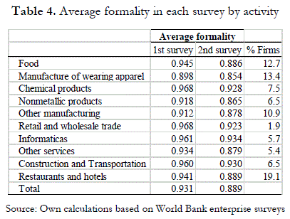 Table 4 displays the distribution of formal enterprises according to their activity. In the first survey, Wearing Apparel manufacture is the activity with the highest level of informality, 10 percent. In the second survey, the informality level in this activity drops to 5%. Food and Other Services experienced also a greater degree of informalization between the two surveys.