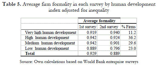 There is a higher percentage of polled firms in developing countries (53 percent) than in developed countries (47 percent). In developing countries (Low and Medium Human Development) the level of formality - 80 and 89 percent - is lower than in developed countries (very high and high human development) - 94 and 92 percent - (See Table 5).