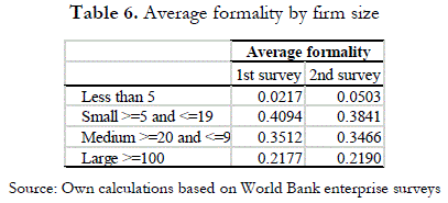 The Enterprise Surveys apply a similar sample design that involves the randomness of the stratified sample in each country, based on the location, size and sector. (World Bank). Although stratification is informed by firms’ census, one of the frequent criticisms to the Enterprise Surveys is their lack of representation of the firms’ size distribution. In other words, small firms are underrepresented. Because most informal enterprises are small, this bias results in a low percentage of informal enterprises, as described in previous lines (See Table 6). From estimations of the size of the informal economy in developing countries (Loayza 1996; Schneider 2002), it is clear that the World Bank surveys underreport the number of informal firms. We could hypothesize several reasons for this underestimation, from difficulty in finding informal itinerant firms to conscious avoidance of tax inspector fearing of being subject to fines or bribes.