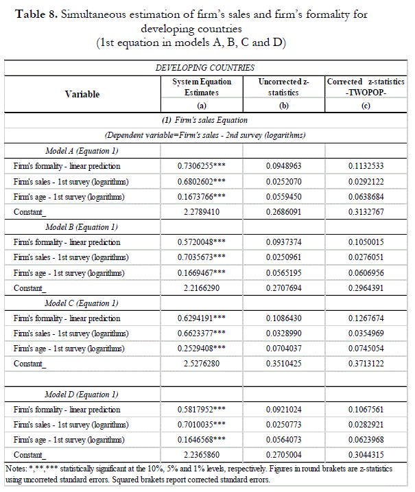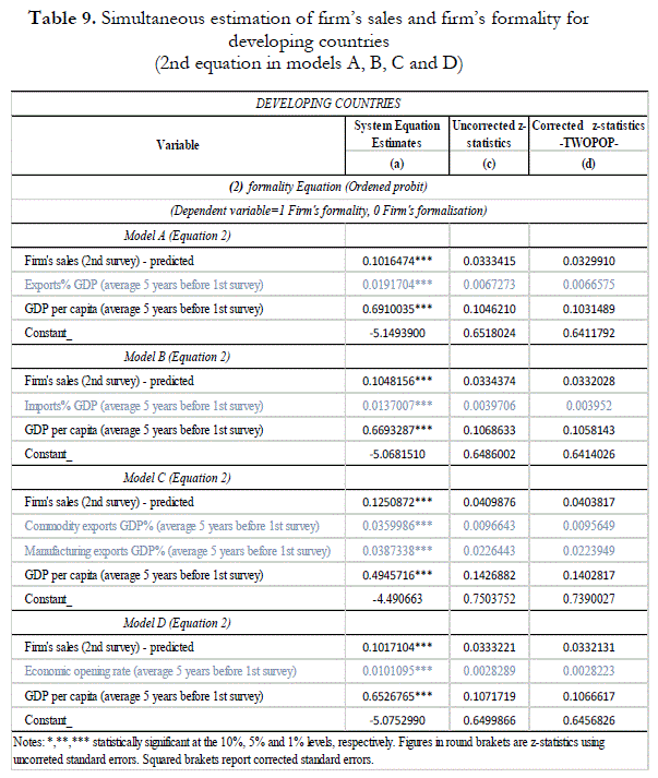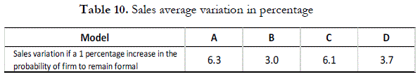 We draw on cross-section data for 636 companies in 12 developing countries to regress four models of simultaneous equations with dichotomous dependent variable to study the relationship between sales and the probability of a business to continuity as formal. Although the four models are distinguished by presenting different trade openness measures, in each one is evident a positive and simultaneous relationship between the level of sales and formality, as well as an increased likelihood of the firm to stay in formality in case the firm operates in a more open economy (See Table 8 and Table 9).