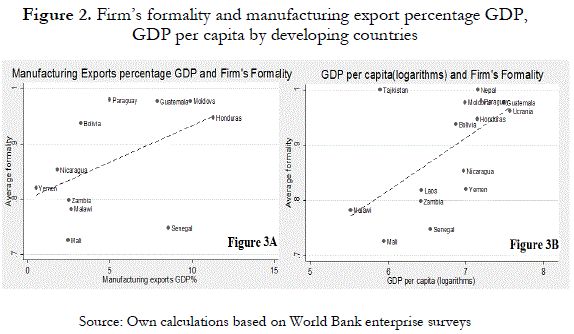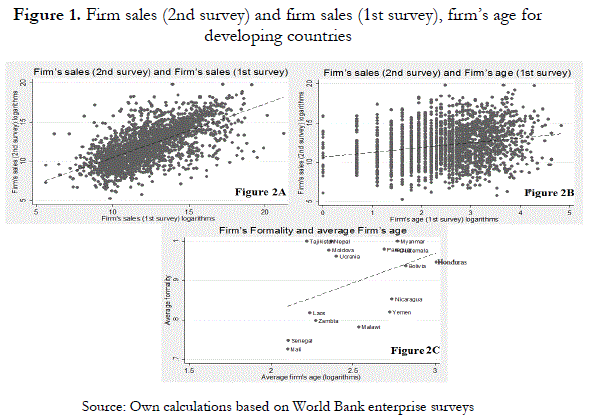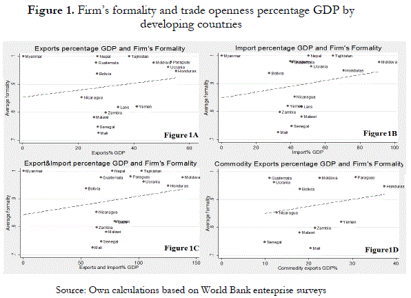 From an exploratory point of view, we observe a positive relation between trade openness and average formality by country (See Figure and Figure 2). Also, the average age of firms by country has a positive relation with formality (See Figure 1). As expected, data collected from the Enterprise Surveys show a positive relationship between firm size and formality (Table 6), in line with firm size duality.