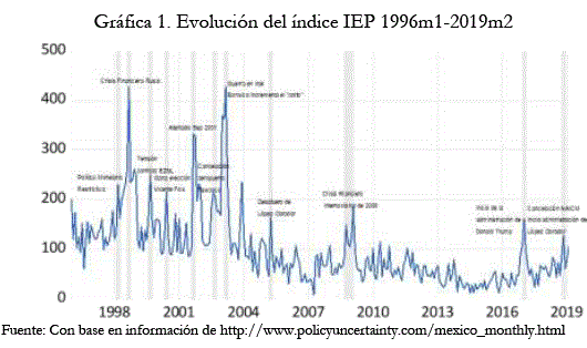 Con la metodología de Baker, Bloom y Davids (2016), se han calculado índices IEP para 23 países, entre los cuales se encuentra México. La información esta disponible en frecuencia mensual para el periodo de que corresponde de enero de 1996 a febrero de 2019 y se puede obtener del sitio http://www.policyuncertainty.com/index.html. En el caso de México, se utilizan tres periódicos El Reforma y El Norte con un seguimiento desde enero de 1996, y desde enero de 1999 se incluye a el periódico El Mural. Los conceptos buscados en las notas periodísticas están relacionados con tres temas: Económico (económica y economía); Político (regulación, regulaciones, déficit, déficits, presupuesto, presupuestos, Banco de México, Los Pinos, Congreso General, senado, Cámara de Diputados, legislación, legislaciones, ley, leyes, arancel, aranceles, impuesto, tributación, impuestos, tributaciones, militar, militares, Guerra, guerras, Reserva Federal); y de Incertidumbre (incierto e incertidumbre). Siguiendo el mismo procedimiento se registran el número de noticias sobre estos temas respecto al total de noticias en cada periódico por mes, y se dividen por la desviación estándar de todas las noticias tomando como primer periodo de enero de 1996 a diciembre de 2006. El siguiente paso, es calcular el promedio por periódico de esta nueva variable al mes y finalmente se escala la serie resultante a una media de 100, con el segundo periodo de enero de 1996 a febrero de 2019.