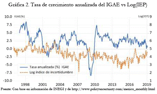 En este sentido, resulta interesante utilizar este índice IEP para evaluar los impactos de la incertidumbre en la economía mexicana. Asumiendo como hipótesis que la incertidumbre induce a un comportamiento de precaución por parte de las empresas y consumidores, que se traduce en menores niveles de inversión y producción (Basile y Girardi, 2018).