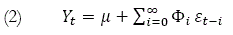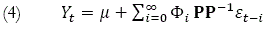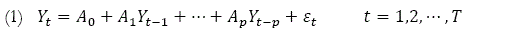 Donde Yt es el vector de dimensión k X 1 de variables endógenas en el sistema, Ao incluye k x 1 términos constantes, las A1,....Ap representan las matrices de orden K x K los parámetros asociadas a cada rezago y ξt es el vector k X 1 de términos de error. Una de las principales aplicaciones de los modelos VAR, es la función impulso-respuesta (IRF) que permite trazar la trayectoria de respuesta de las variables del sistema ante un choque aleatorio7 que se denomina impulso. El valor del impulso, puede ser una desviación estándar del error, y refleja la noción de que el choque aleatorio puede suceder en algún punto del tiempo. La forma de especificar la IRF es por medio de definir el modelo VAR(p) como un modelo de media móvil MA de orden infinito: