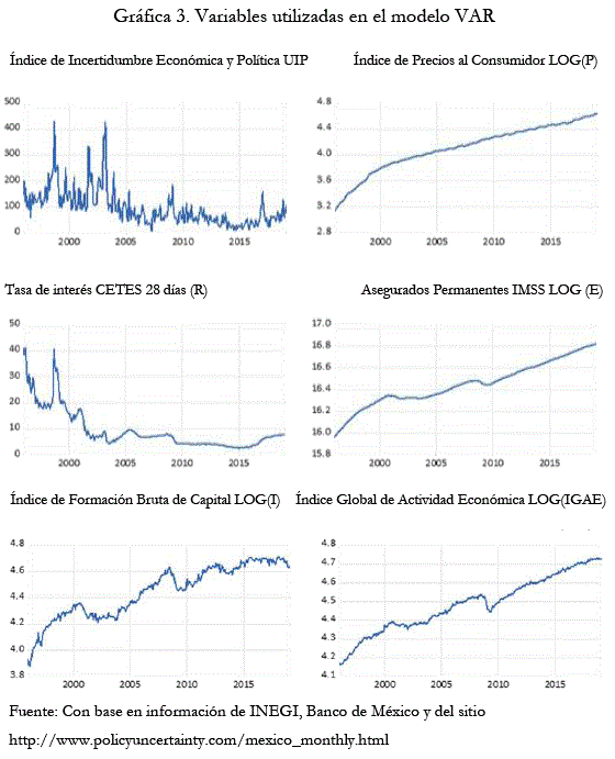 La especificación del modelo VAR utilizado en la presente investigación, considera información mensual8 para el periodo de enero de 1996 a febrero de 2019. Como variable proxy de la incertidumbre el logaritmo del índice IEP (logIEPt); el logaritmo del índice de precios al consumidor (logPt), para medir el impacto en los precios; la tasa de interés de los CETES a 28 días, como proxy del instrumento de política monetaria (Rt); logaritmo del número de empleados registrados en la seguridad social (logEt), que es un indicador de corto plazo del nivel de empleo; el logaritmo del índice de formación bruta de capital fijo (loglt), como indicador de la inversión total y el índice global de la actividad económica (logIGAEt), como una medida de la producción total de la economía.