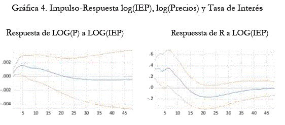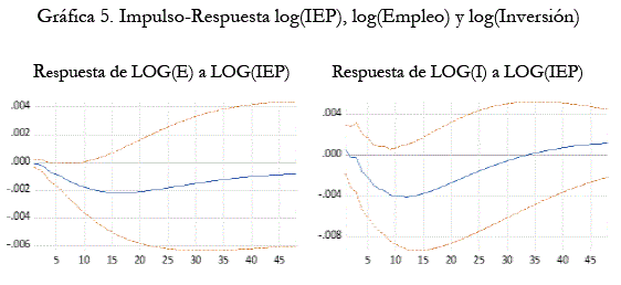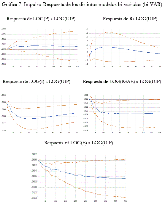 A fin de contrastar los resultados del impulso-respuesta, y debido a que la respuesta de las variables del sistema se puede modificar si se modifica el orden de las variables. Por esta razón, se especificaron distintos modelos11 bi-variados (biVAR) que consideran cada una de las variables del sistema por separado (precios, tasa de interés, empleo, inversión y producción) con la variable de incertidumbre IEP, en este caso el logaritmo de IEP es incluida después de cada variable del sistema. Se realiza un análisis impulso-respuesta, para 45 meses, de un choque aleatorio de una desviación estándar en la incertidumbre. La Gráfica 7, presenta los resultados y se aprecia que las distintas respuestas presentan trayectorias similares al modelo multivariado. Es decir, aumento en el nivel de precios y tasas de interés, y una reducción en la inversión, el empleo y la producción. Confirmando que la incertidumbre tiene efectos negativos y persistentes en la economía.