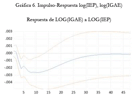 En la Gráfica 6, se presenta la respuesta del indicador global de la actividad económica (IGAE) ante un choque aleatorio de la incertidumbre. La respuesta es negativa a partir del segundo mes, alcanzando una contracción de -0.8% hasta el mes 8, esta respuesta negativa se anual después de 37 meses, regresando a su valor de equilibrio. Resultado que también es consistente con otras investigaciones (Basu y Bundick, 2017; Jurado, Ludvigson y Ng, 2105; Bachmann, Elstner y Sims, 2013). En las cuales se reporta que la incertidumbre es contraciclica, por lo tanto, en periodos de crisis tiende a incrementarse afectando las decisiones de inversión y en consecuencia se afecta la producción y el empleo, reforzando la fase depresiva del ciclo.