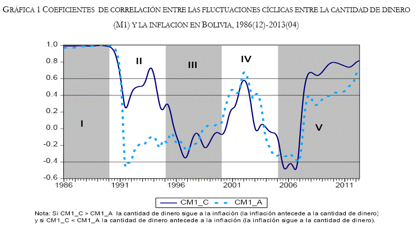Como se describió es la sección previa, las fluctuaciones dinámicas de la cantidad de dinero y la inflación se mide mediante los coeficientes de correlación para submuestras de cinco años que se desplazan en el tiempo. Para ejemplificar la metodología aplicada, se presentan dos gráficas, pero para la interpretación de estas, se toma en cuenta primero, el perfil temporalde la correlaciones permite determinar si la cantidad de dinero (el agregado monetaria M1, M2, M3, M4, la base monetaria y la emisión de dinero de Bolivia) en cuestión antecede (A), sigue (S) o es contemporánea (C) a la inflación (IPC). En ocasiones el perfil temporal cambia en el periodo, por lo que a veces son clasificados de tipo A-S, indicando que las fluctuaciones del ciclo de la cantidad de dinero primero anteceden y después siguen al indicador del ciclo del IPC. Cuando el perfil temporal es muy cambiante en el tiempo, se lo clasifica como inconsistente (I). Segundo, el grado de integración que se clasifica en débil (D), moderado (M) o fuerte (F) de acuerdo con los rangos para los coeficientes de correlación definidos previamente. Para estos casos también se puede tener combinaciones del tipo M-D o bien coeficientes de correlación muy erráticos, por lo que la clasificación respectiva seria inconsistente (I). Finalmente, se analiza también la tendencia de integración clasificándola en decreciente (D) o creciente (C) dependiendo de si los valores de los coeficientes de correlación aumentan o disminuyen en el tiempo. Cuando la tendencia del coeficiente correspondiente se estabiliza en torno a algún valor, caracterizamos la tendencia de la integración como estable (E), por lo que tiene combinaciones del tipo E-D si es que durante la muestra los valores de los coeficientes de correlación se mantienen estables, pero al final decrecen. Adicionalmente también se presenta una clasificación más dentro de la tendencia de integración y es cuando durante la muestra crecen los valores de los coeficientes de correlación, luego decrecen y finalmente vuelven a crecer este tipo de situación se la ha clasificado como inconsistente (I).