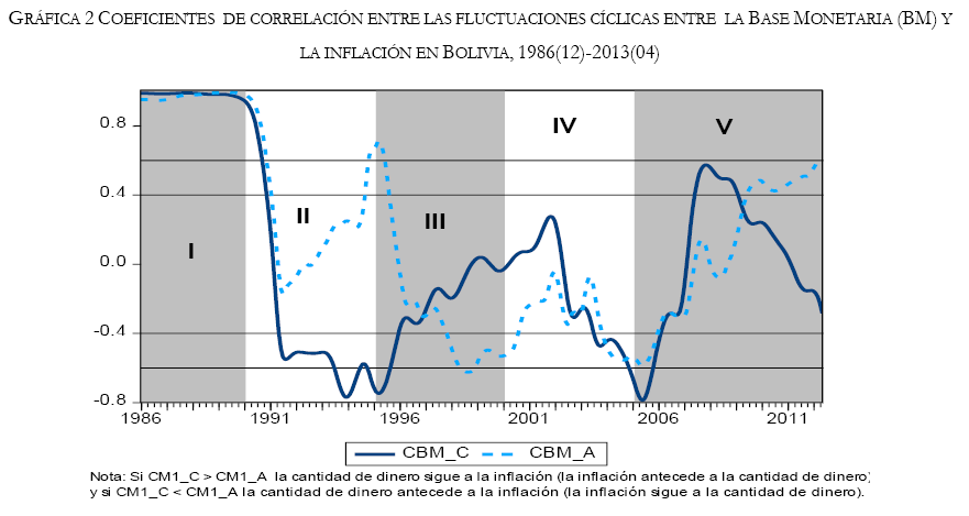 Desde un punto de vista, las correlaciones de las fluctuaciones dinámicas entre la cantidad de dinero e inflación en Bolivia, se pueden resumir en los siguientes periodos: la relación de los 80's era fuerte y estable entre la cantidad de dinero (el ciclo de los diferentes constructos) y la inflación (ciclo inflacionario), y así, la inflación primero precede al dinero y luego sigue a este. Para los 90's la relación en la mayoría de los casos es inestable, así también no se puede definir un perfil temporal común y las relaciones entre las variables son débiles y moderadas; sin embargo, ya para los albores del siglo XXI se puede observar que la inflación sigue al dinero y luego precede, con relaciones que van de débiles a moderadas con una tendencia de integración de creciente a decreciente (2001-2005), y de débiles a fuertes con una tendencia de integración de decreciente a creciente (2006-2013).