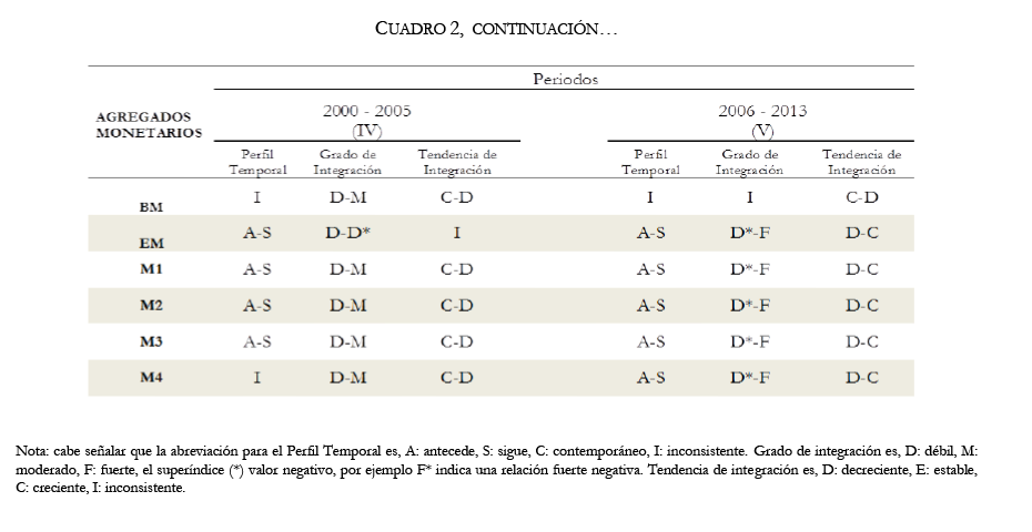 Para principios del siglo XXI (2000-2005) un perfil temporal donde el ciclo del IPC sigue y luego antecede a los ciclos de la EM, M1, M2 y M3; pero no se puede apreciar un perfil temporal con los ciclos de la BM y M4. En cuanto al grado de integración se puede apreciar un rumbo bien definido con relaciones débiles hacia una transición moderada. La tendencia de integración es creciente y decreciente, excepto con la EM que fue inconsistente.