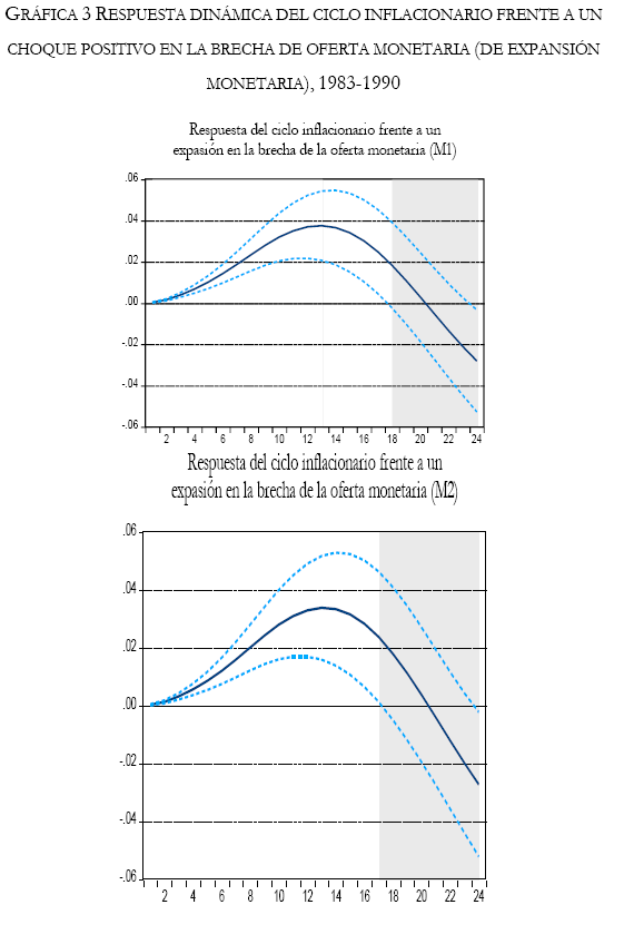 Al evaluar funciones de impulso-respuesta en 24 meses hacia adelante (t + h), en la gráfica 3 se visualiza que una perturbación positiva en la brecha de la oferta de monetaria (expansión monetaria mediante M1 y M2) produce un efecto positivo y significativo en el ciclo inflacionario hasta el décimo séptimo mes hacia adelante y no produce ningún efecto para los otros meses (el efecto es cero), esto para la década26 de los 80's.