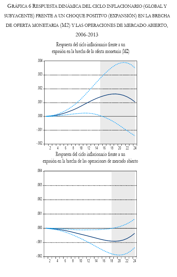 Por otro parte, la respuesta del ciclo inflacionario frente a una expansión en la brecha de la oferta monetaria (a través del constructo M1 y M2) es muy diferente en el tiempo, en resumen primero, para los 80's la inflación responde a la oferta monetaria (de manera positiva y temporal), segundo, para los 90's la inflación no responde a la oferta monetaria (la respuesta es cero) y por último, para los albores del siglo XXI la inflación nuevamente responde35 a la oferta monetaria (temporal y positivamente, pero en mayor medida responde a M2), de la misma manera, responde la inflación subyacente (la inflación subyacente responde de manera positive y temporal a la oferta monetaria M2 para 2006-2013). Además de eso, la respuesta es negativa y temporal de la inflación global y subyacente frente a una expansión en la brecha de las operaciones de mercado abierto.