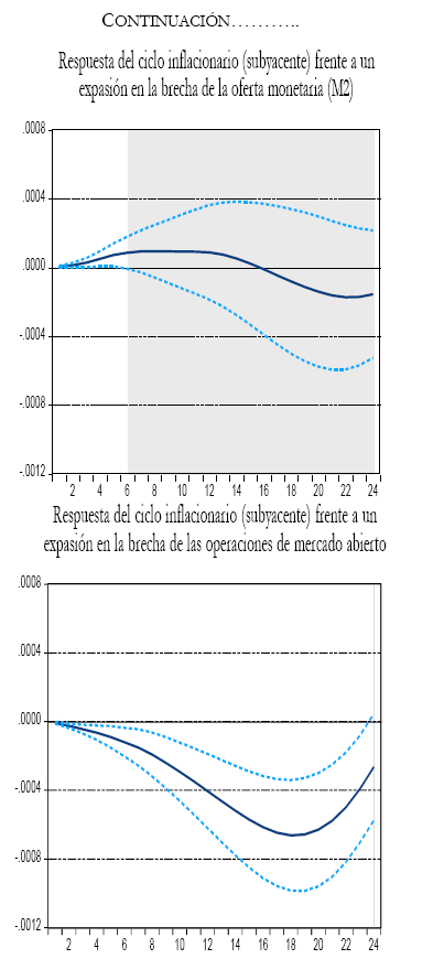 Sin embargo, el escenario es diferente cuando se observa la respuesta del ciclo inflacionario (subyacente) frente a una perturbación positiva de la brecha de la oferta monetaria (M2), presenta un efecto positivo y significativo hasta el sexto mes hacia adelante. Y un efecto permanente frente a la brecha de las operaciones de mercado abierto, el efecto es negativo y significativo.