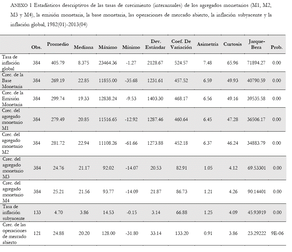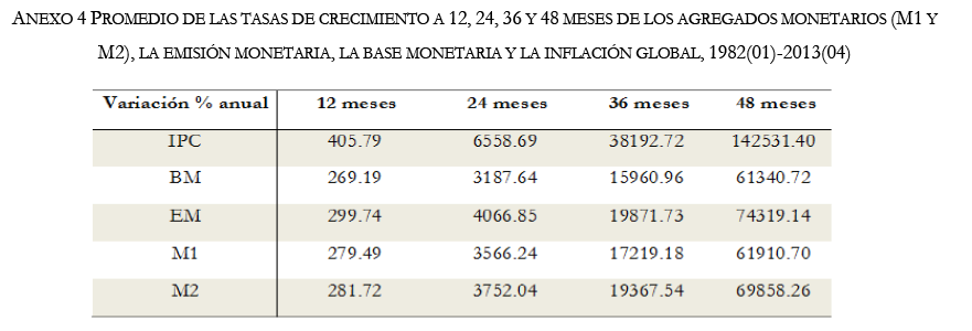 Para el caso de México, se menciona el análisis de la inflación de Guerrero y Arias (1990), que mediante modelos VAR pretenden pronosticar la inflación, pero sus estimaciones muestran que existe una relación positiva entre la base monetaria e inflación, después de considerar en su modelo diferentes periodos de cambios estructurales. Por último, se menciona la investigación de Liquitaya, Gutiérrez y Ramírez (2013) donde analizan dinero, precios y actividad económica en México, pero adicionalmente revelan que existe una causalidad bidireccional entre la base monetaria y los precios.