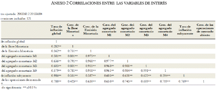 Por otra parte, mediante las correlaciones cruzadas se considera al agregado monetario M2 antecede a la inflación (la emisión monetaria y el agregado M1 son contemporáneos a la inflación), en tal sentido, la inflación está siguiendo al agregado monetario M2, por lo tanto, se debe considerar como variable importante para la conducción de política monetaria, en otras palabras se consideraría como proxy de la oferta de dinero dentro de la economía. Esto va relacionado con lo que menciona De Gregorio (2003) que en países industrializados de elevado grado de sofisticación financiera utilizan como oferta de dinero los agregados monetarios menos líquidos (M2 oM3).