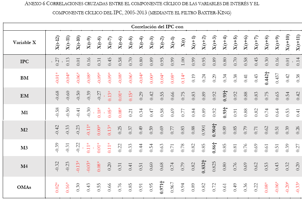 En los periodos más actuales (2006-2013), se observó que el ciclo del IPC primero sigue25 y luego antecede a los ciclos de la EM, M1. M2, M3 y M4. No se pudo definir un nada con relación al ciclo de la BM. Para el grado de integración muestra que de una relación débil negativa (2006-2008) hacia una transición brusca de relación fuerte positiva con los ciclos de la EM, M1, M2, M3 y M4; no se define el grado de integración del coeficiente de correlación del ciclo del IPC con el ciclo de la BM. Dentro de la tendencia de integración es la misma para EM, M1, M2, M3 y M4; donde primero decrece y luego crece, es contraria la situación con la BM. Durante esta primera década del siglo XXI de manera general, se puede apreciar la transición del grado de relación débil de finales del siglo pasado hacia una relación moderada y fuerte positiva que existe entre el dinero y la inflación.