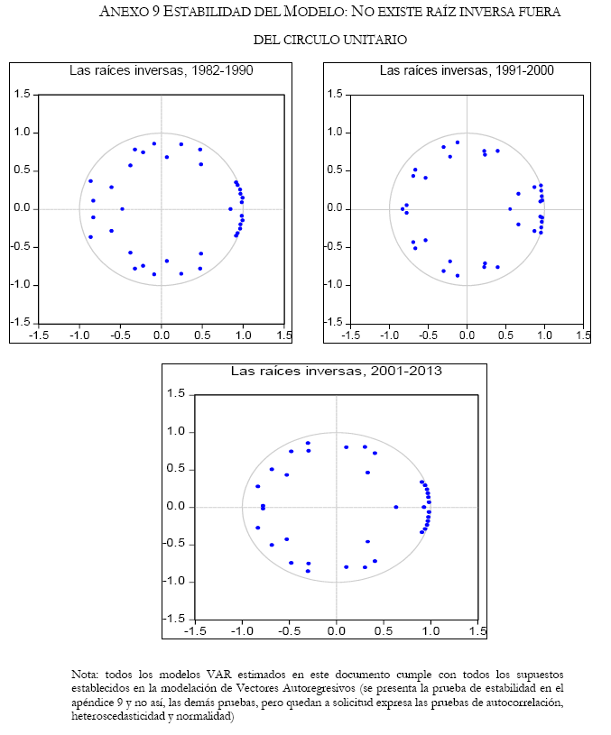 26  Sin embargo, se debe mencionar que la muestra inicial 1980-2015, después de aplicar los filtros para obtener el componente cíclico se reduce a 1982-2013, y en tal sentido, después de estimar el modelo VAR (se pierden 12 observaciones por los rezagos del modelo) la muestra se acorta para la década de los 80's a 1983-1990. Todos los modelos VAR estimados de aquí en adelante, cumplen con los supuestos establecidos por la modelación de Vectores Autoregresivos, es así, en el apéndice 9 se presenta la prueba de estabilidad (las pruebas de autocorrelación, heteroscedasticidad y normalidad están disponibles a solicitud expresas).