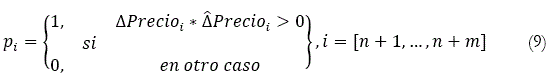 variación estimada, n = 0 y m = 203 ó 109, pi se refiere al precio observado en el período i que es representado por t que también se refiere al período o tiempo en el que se observa el precio. De esta manera, los modelos multivariados dinámicos construidos optimizados con técnica fuerza bruta fueron evaluados en función de su capacidad para predecir el signo de los movimientos del precio del valor en estudio.